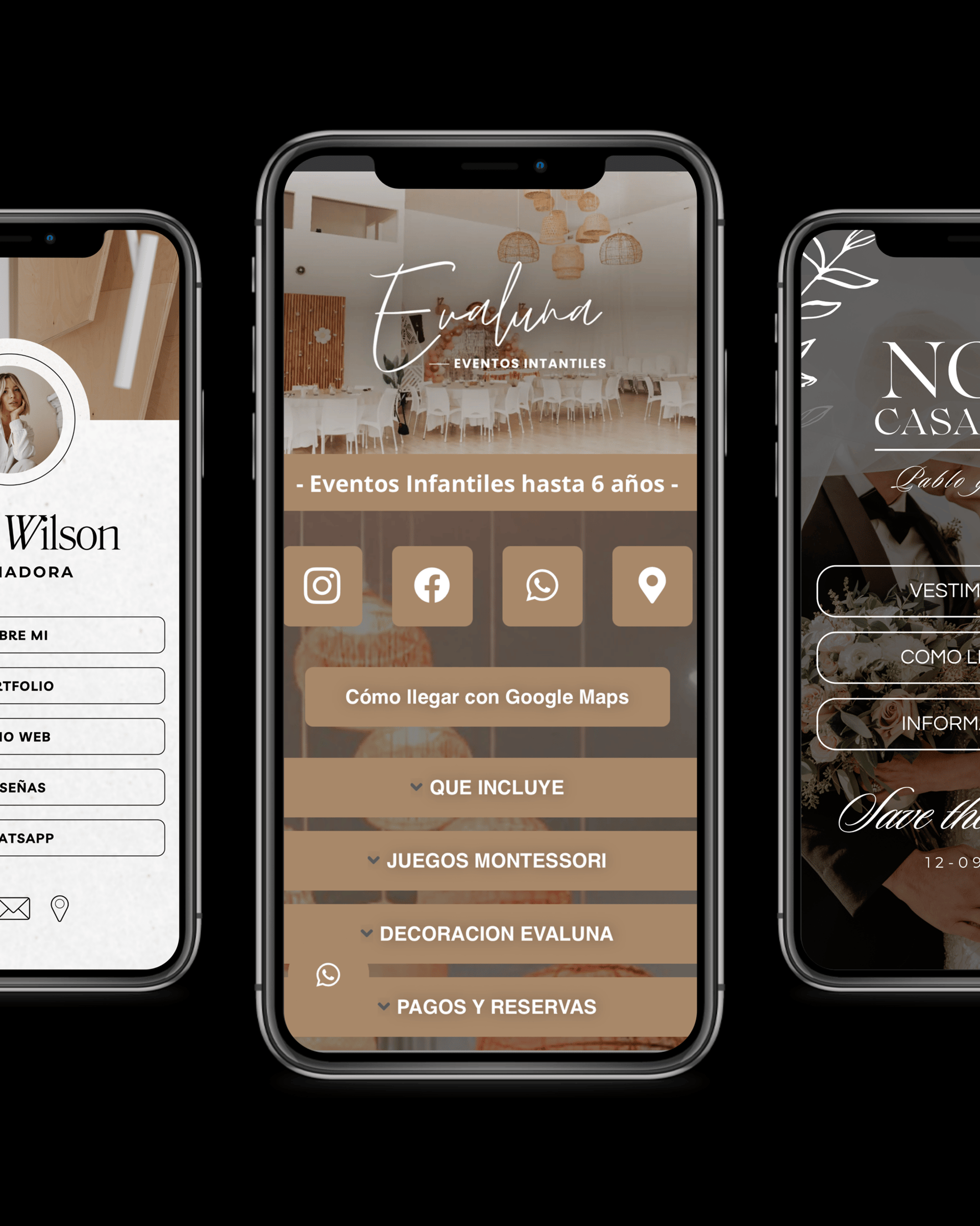 Fotos, redes, juegos, catering, decoración, medios de pago.