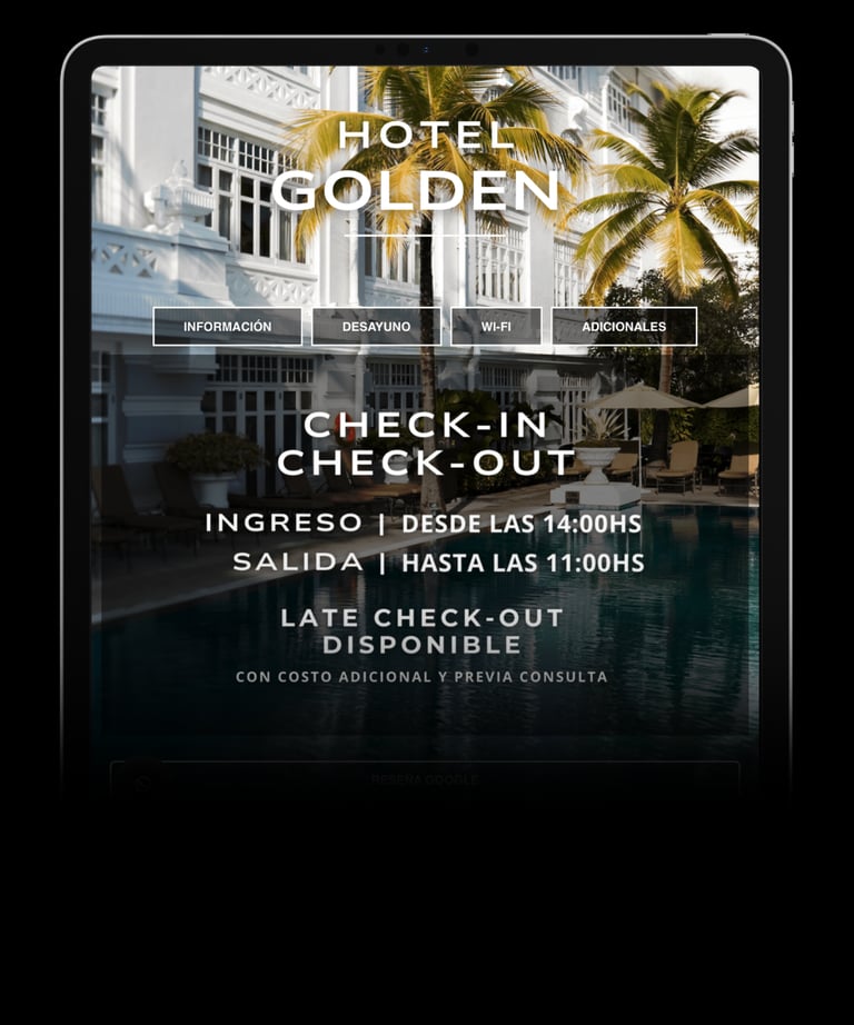 Horarios de check-in y check-out, reseñas, cómo llegar, fotos, desayuno, WiFi, cochera, y traslados.